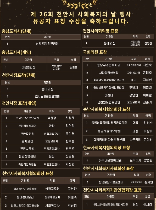 제 26회 천안시사회복지의 날 행사 유공자 표창수상 페이지 정보 작성자작성자 : 천사협 조회조회수 : 522회 작성일작성일 : 25-09-23 13:14 본문 수상을 축하 드립니다! 목록 다음글「제26회 천안시사회복지의 날 행사」사회복지 유공자 추천 협조 요청 25.07.28